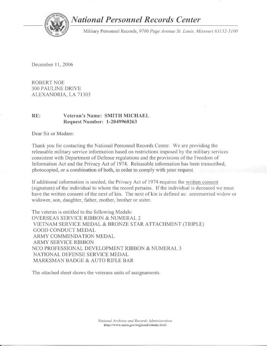 SMITH'S MILITARY RECORDS FROM THE NATIONAL PERSONNEL RECORDS CENTER SHOW: |