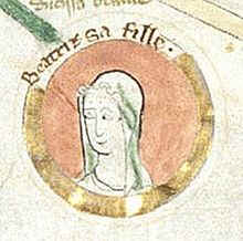 Beatrice of England (24 June 1242[1] ? 24 March 1275), also known as Beatrice de Dreux, was a Princess of England as the daughter of King Henry III of England and Eleanor of Provence. Her siblings were Edward I of England, Margaret, Queen of Scotland, Edmund Crouchback, 1st Earl of Lancaster, Richard of England, John of England, Katherine of England, William of England, and Henry of England. She and her family were members of the Royal house of Plantagenet, which first ruled in the 12th century and was founded by Henry II of England. (Note: this line is entered into through Medric Troy Bell's Farmer ancestors) |