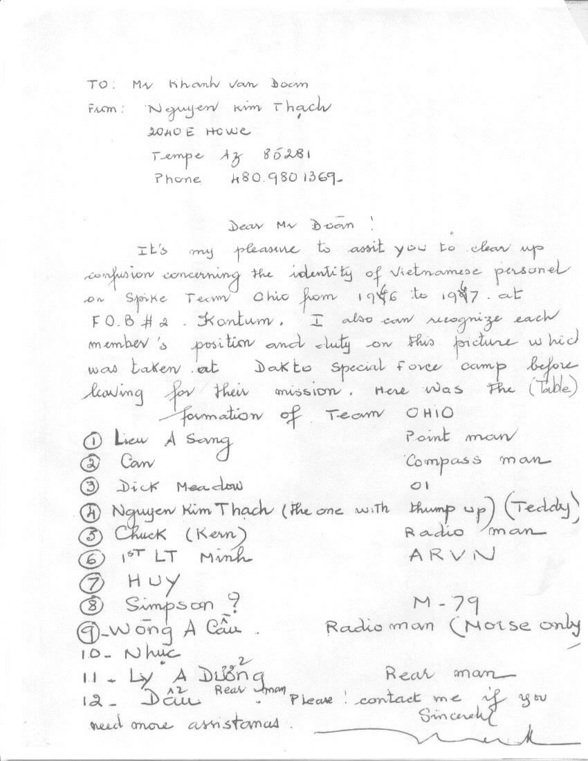 STANDING LEFT TO RIGHT: Huy, Wong A Cau, MSG Meadows, 1st Lt Le Minh, SFC James A Simpson?, SFC Charles N. "Chuck" Kerns, Can, and Dau KNEELING: LEFT TO RIGHT: Lieu A Sang, Nguyen Kim Thach "Teddy", Nhuc, Ly A Duong. Positions held by team members: Americans-MSG Meadows-One Zero; SFC Simpson-One-one; SFC Kerns-One two. Vietnamese: Sang-Point Man; Can-Compass Man; Thach-Interpreter; Minh-ARVN; Huy-?; Can-Radio Man; Nhuc-?; Duong-Rear Man; Dau-Rear Man (The identity of the 3rd American identified by Thach as ?Simpson? The assumption is made that this is SFC James A. Simpson, the only Simpson listed in Sherman's "Who's Who" that seems to fit the time period under the FOB2 section).