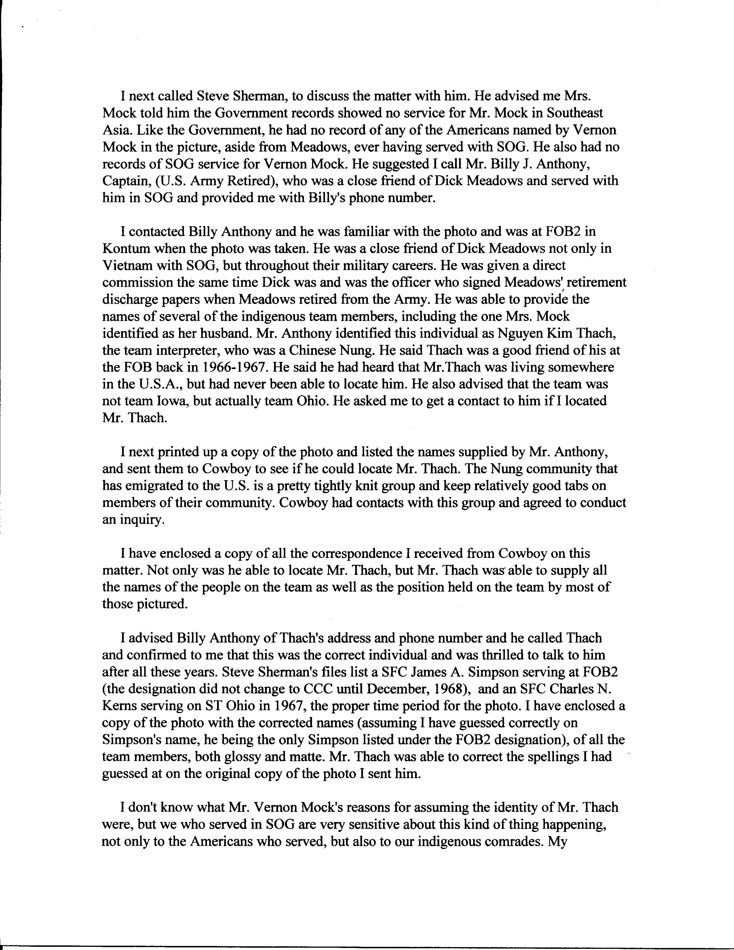 Seems the late Vernon T. Mock has stolen the identity of "Nguyen Kim Thach'', nicknamed "Teddy" by the Americans on his team. Thach was the interpreter on Spike Team Ohio in 1966-67 under team leader Dick Meadows.. Mock's wife claims Mock was a Hawaiian of Chinese descent and had for sometimes said he was the person in the picture with his thumb up. According to his wife the military has no record of Mock serving in Vietnam or SOG and hints at a conspiracy and cover-up (isn't that always the bull the Wannabe come up with?). What a sorry piece of shit Mock is to leave his family with such a fraud.