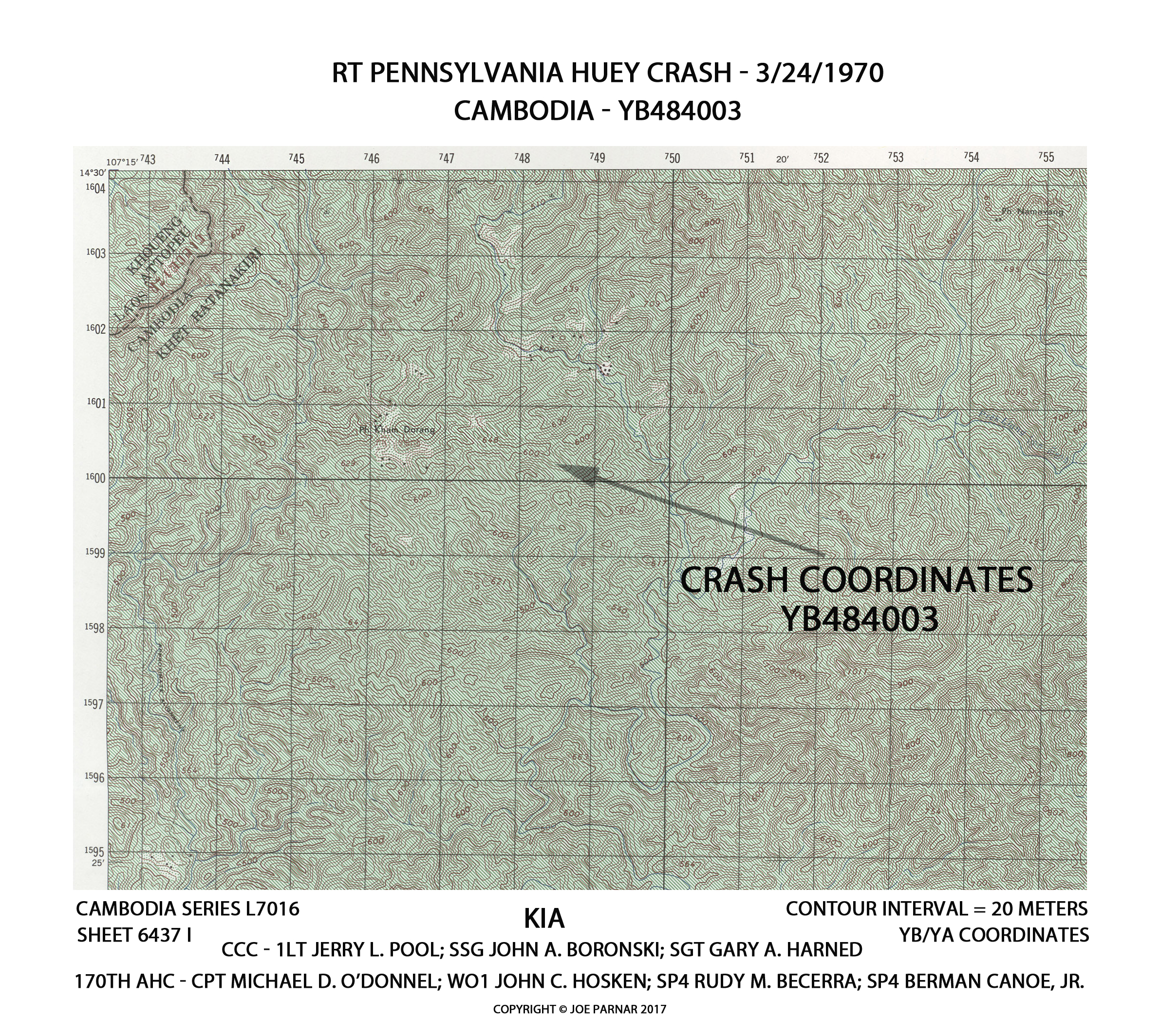 24 Mar 70- Jerry Lynn Pool, 1LT 0-2, RT one-two of Freeport, IL, John Arthur Boronski , SSG E-6, Tm One-Zero, of Ware, Mass, Gary Alan Harned, SGT, Tm One-one, of Springboro, Pa USASF and Special Command commando Scouts (Number and names unknown) CCC, Kontum, RT Pennsylvania, Ops 35 and Michael Davis O'Donnel, Cpt, Pilot of Springfield, Ill, John Charles Hosken, Co-Pilot, WOI, 0-2 of Chagrin Falls, OH; Rudy Morales Becerra, SP/4 of Richmond, TX and Berman Ganoe, Jr. SP/4 of Belleview, FL US Army UH-IH Helicopter Crew from the 170th AHC, Tail # 262, Ops 32/75-MIA, Presumptive finding of death. A recon team which had been engaged with an enemy force in Cambodia for three days, requested extraction. The UH-1H, 170th AHC responded in support of the team. The landing zone in the tri-border area 14 miles inside Cambodia, had enemy forces closing in, the pilot, ignoring his own safety attempted the extraction. The helicopter set-down on the LZ , the entire team boarded the aircraft and having just loaded the recon team, and in an effort to depart, the helicopter started its assent reaching an altitude of about 100 feet when an explosion was observed in the aircraft. The aircraft continued to fly for about three hundred meters when another explosion occurred. No bodies were seen being thrown clear of the exploding aircraft. The aircraft crashed and burned uncontrollably. No rescue was attempted due to heavy enemy fire. See "No Name Creek" Tales from SOG, Also see the "Into the Killing Zone, Mar 24, 70," Tales from SOG Subj: