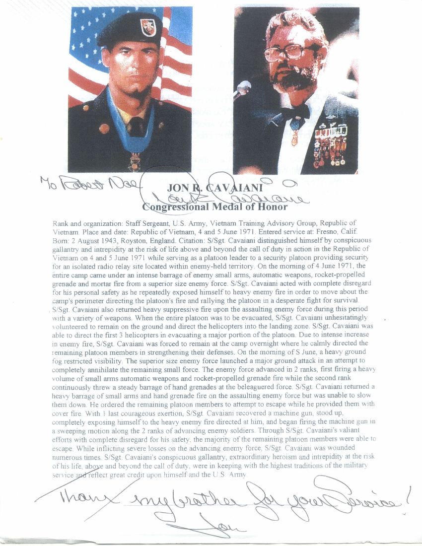 Jan 9, 2010: Ralph A. Morgan, SGT, TFIAE, Related that he was the last person off Hill 950 about 8pm, 4 Jun 71, on a Huey, that he went over to the Americans (At that time, there were only two Americans left on the hill) and asked them to leave on the Chopper with him, they refused. At the time, he says they had been fighting all day and they were wide eyed. Sgt Morgan stated he did not understand why they refused to leave because it was obvious the hill was going to fall and there was no way it could be defended any longer as he was the last defender to the East facing hill 1015 fighting with an M60, now there was nothing defending the saddle between Hill 1015 and 950 and the enemy could just walk across. The two remaining Americans were SSG Jon Cavaiani and SGT John Robert Jones, thus, it must have been Jon Cavaiani who refused to leave Hill 950 as he was senior NCO and in command of the hill. In conversations with Jon in the past he has said he would never have left his Bru as long as there was fight still in him. Jon Cavaiani stated that Sgt Morgan, the Radio Operator, came to him requesting that he stay, but Cavaiani "ordered" him to leave, that he and Jones would stay with the remaining Bru. NOTE: The US Marine Corps occupied Hill 950 and during 1968, the NVA occupied Hill 1015 which was higher than 950 and 950 was in range of 1015 so whoever occupied 1015 could lob anything they wanted down on top of 950 and overran Hill 950. They did it in 68 and again in 71.