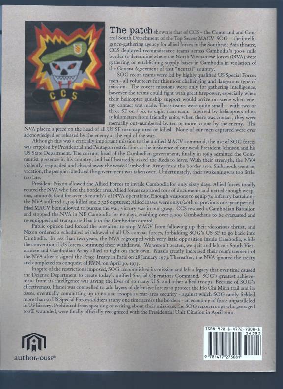 The Initial Review by noted SOG author, MAJ John L. Plaster, notes: “"Chief SOG, Col. Steve Cavanaugh's greatest regret was that SOG's "tremendous unsung heroes" deserved recognition which was not possible for their highly classified missions. My books on SOG, too, lacked enough space to recognize all the gallant warriors who fought in SOG's secret missions. Today, thanks to Lt. Col. Fred Lindsey's devoted research and writing, the veterans of Projects Sigma and Omega, and Command and Control South Detachment have had that much corrected. Equally importantly, he has incorporated all 14 aviation units that supported them during the six-year period. For without the air support directly under its operational control, and the loyal, experienced indigenous soldiers, CCS could not have accomplished their mission in Cambodia. They were a unified team that lived and fought together. Both as a CCS commander, and a historian, Lt. Col. Lindsey has done his men and his unit proud. What they did is now known, and who they are will not be forgotten. "De Oppresso Liber." ----- John Plaster"