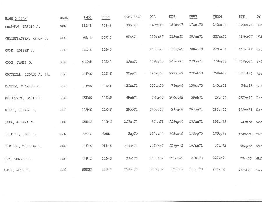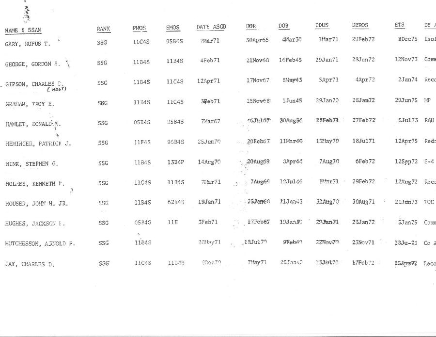 THERE IS A NOTE IN THE RIGHT MARGIN OF THE ROSTER FOR CHARLES GIPSON, NOT SHOWN: "KIA. APR 72. SENT BACK FM FT. DEVENS FOR 1 SPECIAL MISSION