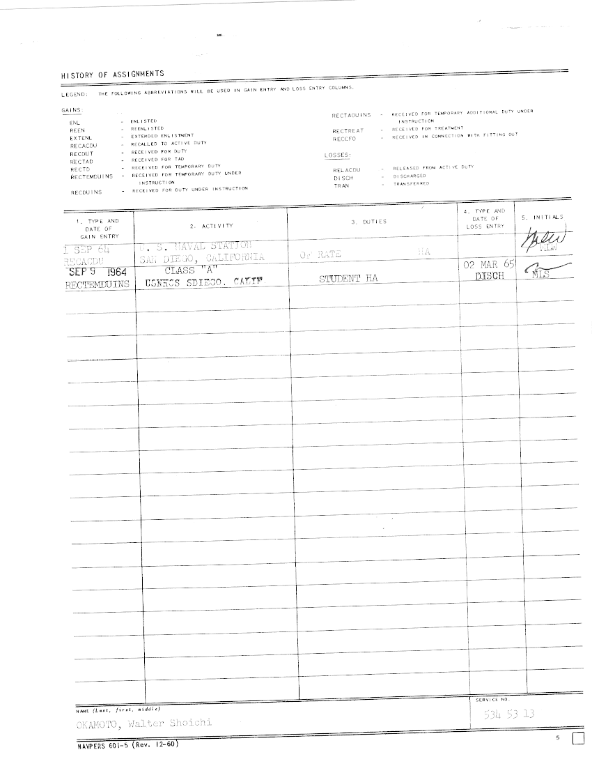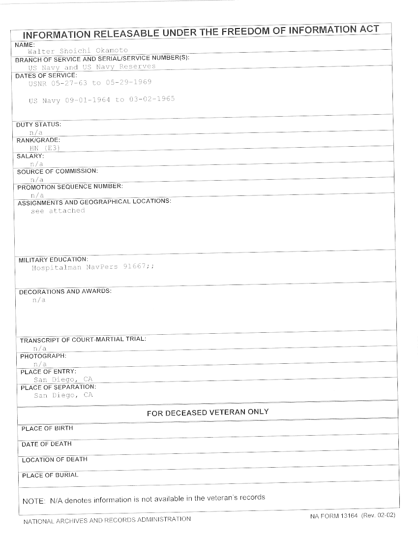 Attached is a copy of a NAVPERS 601 that Walter submitted to validate his service for the VFW. Annotations are by Larry Bailey, Captain, USN Seal, Retired. (Note: The information he submitted is his Reserve time, not Active Duty Service, had Okamoto been sent to Vietnam, he would have received official orders to Active Duty and his military records would have reflected it) Subject: