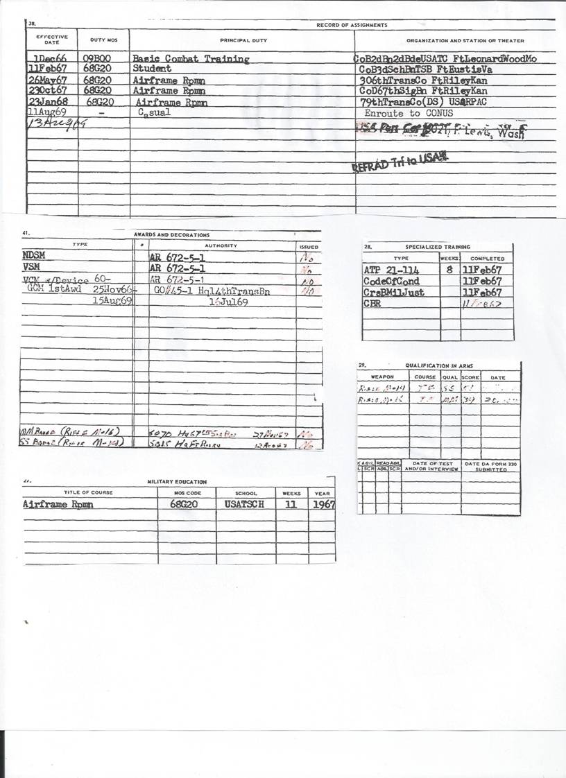 His military records establishes he is another fake SOG warrior, just someone who actually served with the 79th Transportation Company (Aircraft Direct Support) 14th Transportation Battalion (Aircraft Maintenance Support) from Jan 68 to Aug 69 (1 and a half years) as an "Airframe Repairman" MOS 68G20 and never in a combat role and never with SOG. He was never on any Recon Team or saw any combat action and he was never in the infantry. He is what is referred to as a Rear Echlon service member, providing support. See his military records from the National Record Center at the end of this page. His military awards consists of only the following standard awards to all who were in Vietnam: National Defense Service Medal; Vietnam Service Medal; Vietnam Campaign Ribbon with 60 device, Good Conduct Medal...No awards for valor meaning he was never awarded the Silver Star or Bronze Star Medals. He never served in Panama or attended the Jungle Warfare School, he was never wounded or hospitalized for any injuries. He never served with the any Special Forces Group. He never attended Jump School or was qualified as a Paratrooper HE SAW "NO COMBAT ACTION" what so ever. IN OTHER WORDS, EVERYTHING HE CLAIMS IS A FLAT LIE ATTESTED TO BY HIS OWN MILITARY RECORDS. DO NOT ACCEPT ANY EXCUSE ABOUT HIS RECORDS BEING A COVER FOR HIS "TOP SECRET" ASSIGNMENT TO SOG. NO RECORDS WERE CREATED TO COVER ANY SOG TROOPER. FOR EXAMPLE MY RECORDS AND ALL OTHER SOGGER'S RECORDS REFLECT OUR ASSIGNMENTS WITH SOG AND AWARDS WHILE WITH SOG. TO BE TOTALLY BLUNT, HE IS A LYING SON OF A BITCH.